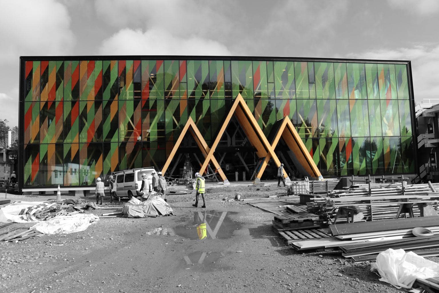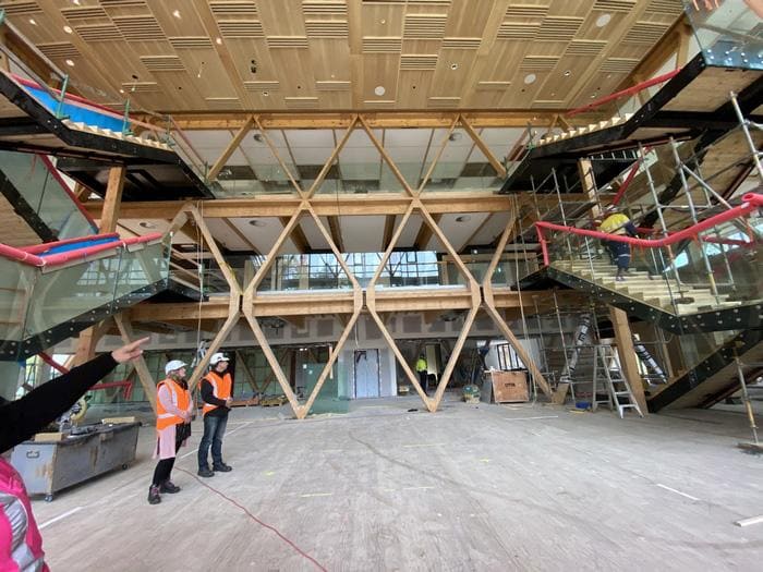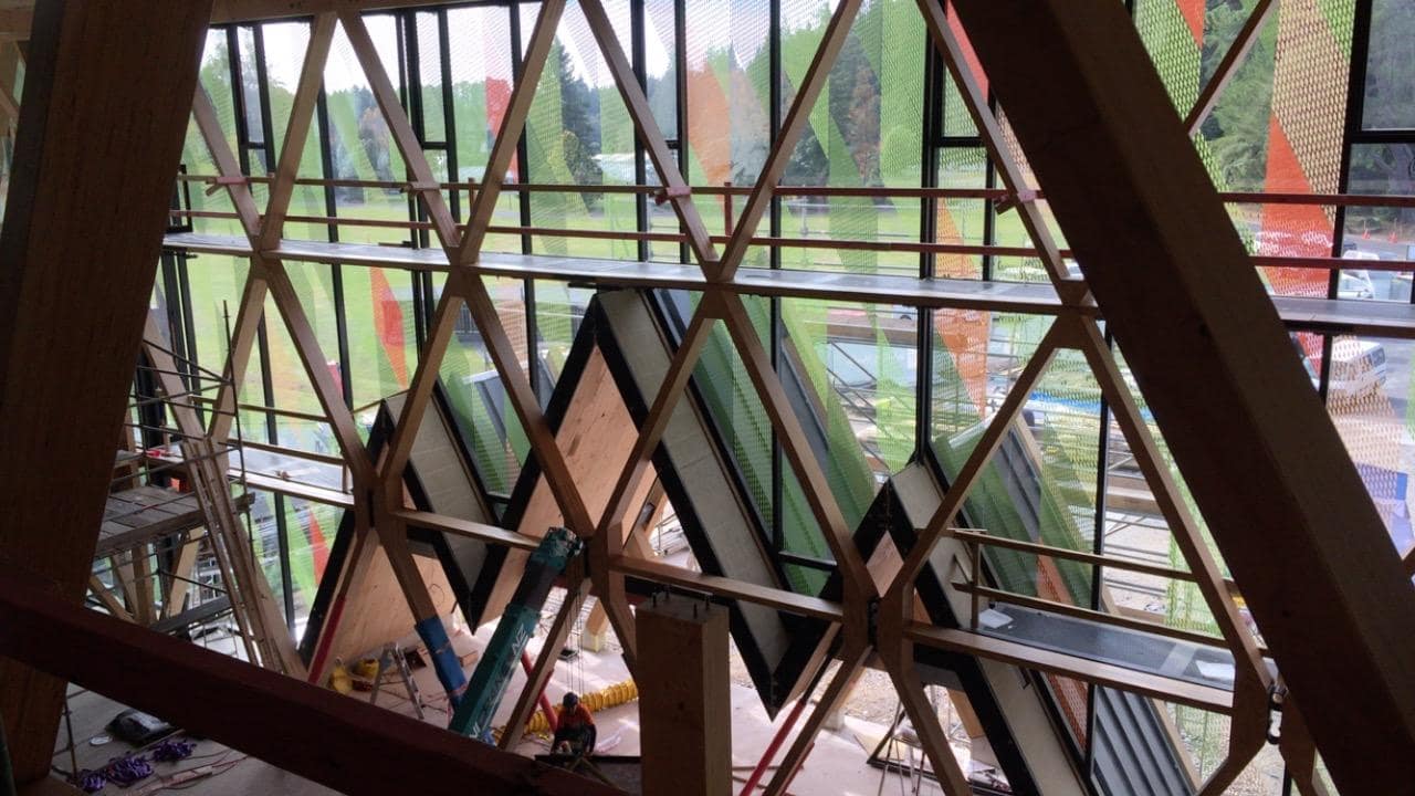 In due course, the ground floor will be open to the public and showcase not only the innovative structure, but also Scion’s research across the forest and biomass value chains. The predominant feature of this three-storey building will be the timber components constructed with painstaking precision and assembled into diagonal grids – see featured, the timber diagrid with central atrium and wrap-around diagonal curtainwall cladding – Makes for a very interesting and unique build.